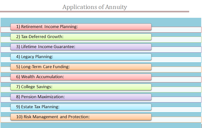 Annuities are financial products that provide a series of regular payments over a specified period of time. They are commonly used for retirement planning, risk management, and investment purposes. In this response, I will discuss ten major applications of annuities along with examples and key points for each application.