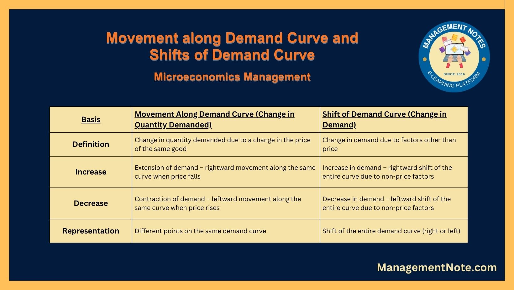 | Movement Along Demand Curve is expressed by the different points on the same demand curve. | Shift Of Demand Curve is expressed by the shift in the entire demand curve either rightwards or leftward.