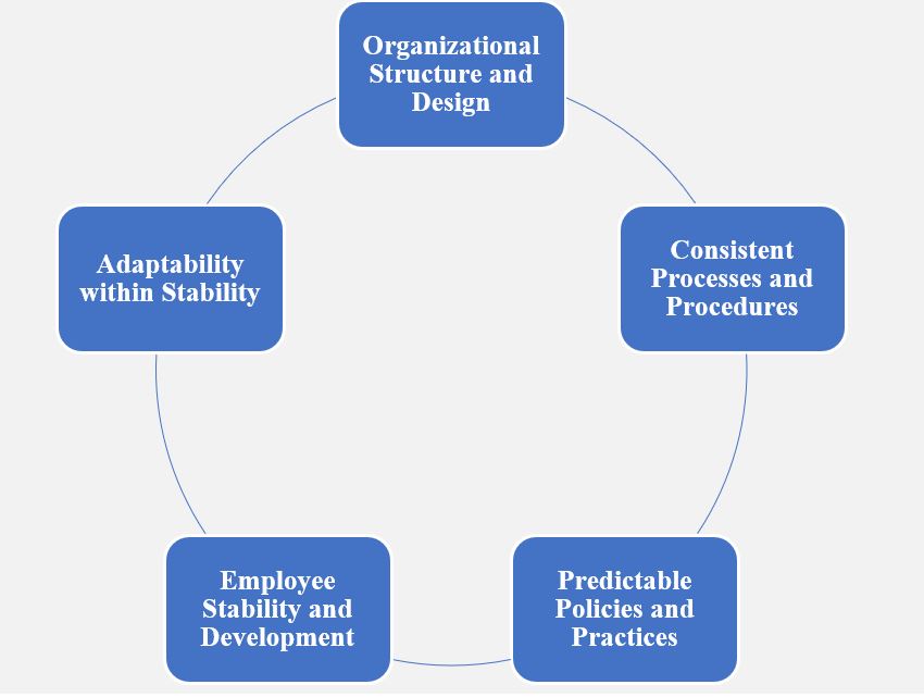 The consistency and reliability of how tasks, projects, and problems are handled contributes to stability through predictable practices. By maintaining consistency, employees are better able to understand what is expected of them in different situations, increasing trust, reducing stress, and improving performance.