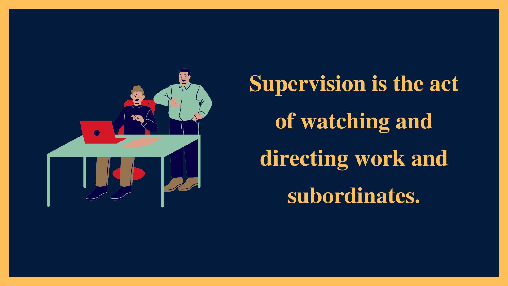Supervision is the act of watching and directing work and subordinates. To ensure that tasks are completed efficiently and effectively, supervisors oversee the work of others and provide guidance, direction, and feedback. In addition, it involves providing support and resources to subordinates so that they can perform their duties to the best of their abilities and monitoring their performance.