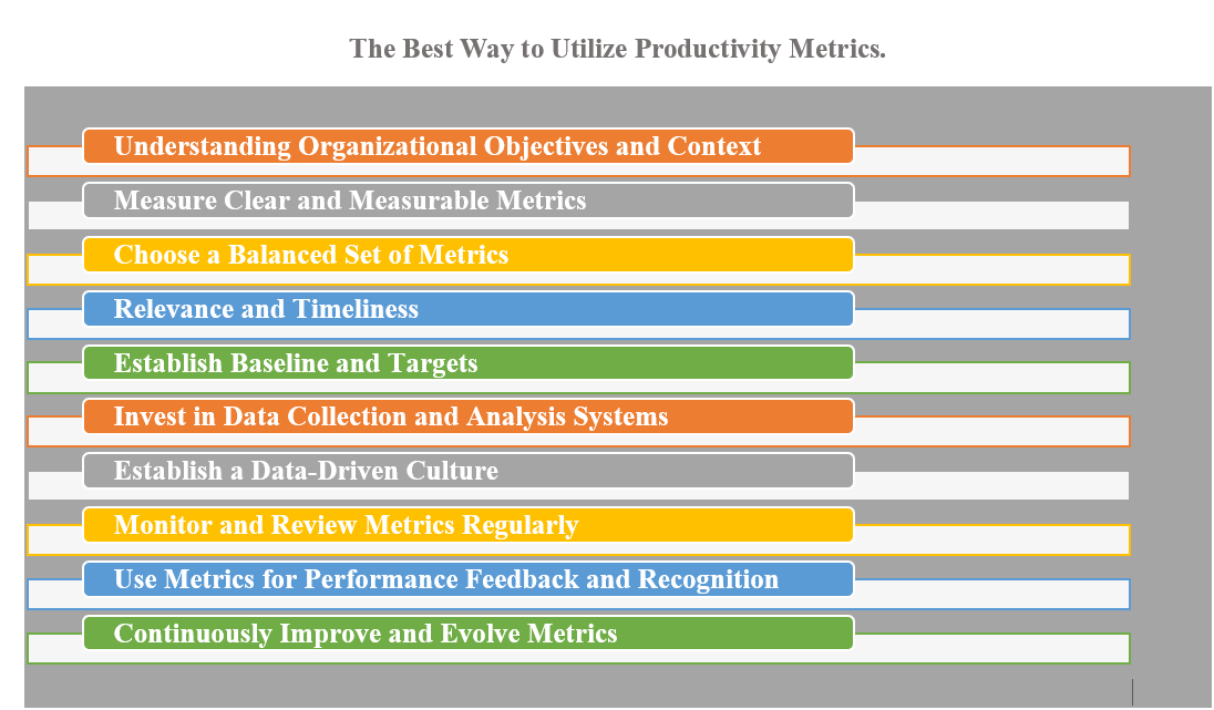 As a result, the best way to utilize productivity metrics is by aligning them with organizational goals, defining clear and measurable metrics, selecting a balanced set of metrics, ensuring relevance and timeliness, setting baselines and targets, implementing data collection and analysis systems, nurturing a data-driven culture, monitoring and reviewing metrics regularly, using metrics as feedback and recognition, and continuously improving and evolving metrics. In order to improve performance, make informed decisions, and achieve sustainable success, organizations should follow these best practices.