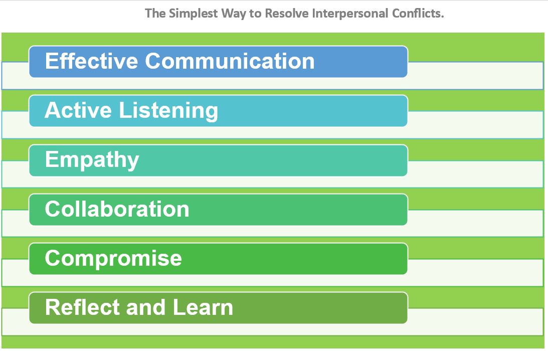 A simple yet powerful approach can be used to resolve interpersonal conflicts, which emphasizes effective communication, active listening, empathy, collaboration, and compromise. Individuals can create a conducive environment for open dialogue, understanding, and finding mutually acceptable solutions by practicing these strategies.