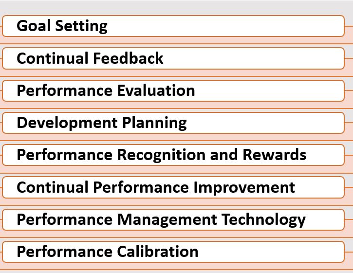 It begins with goal setting and continues with ongoing feedback, performance evaluation, development planning, recognition and rewards, continuous performance improvement, and the utilization of performance management tools.