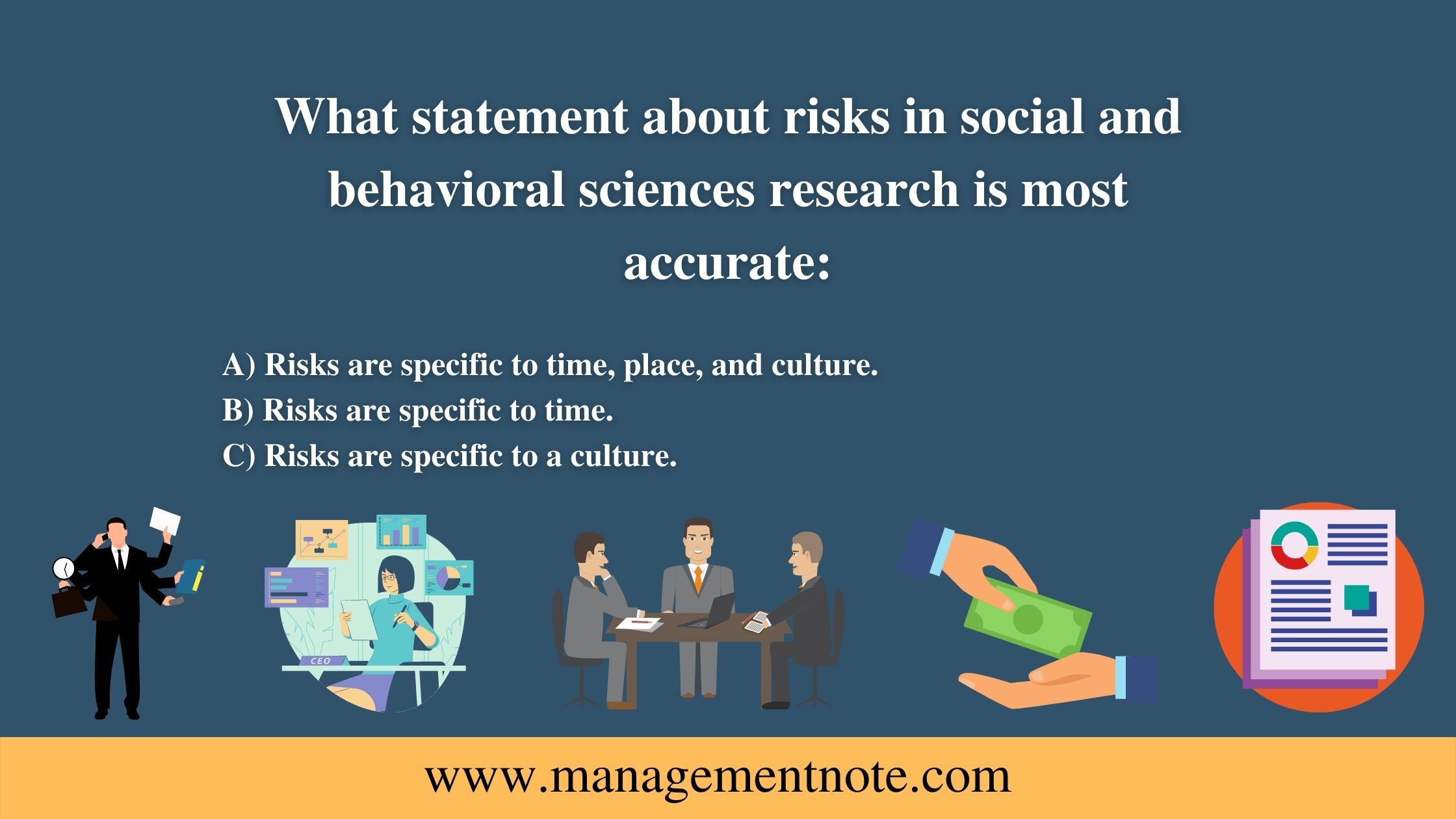 Conclusion: As a result of this, option A is the most appropriate option as it acknowledges the fact that there are a variety of risks associated with social and behavioral sciences research and that those risks can vary according to the particular setting, time, and culture in which the research takes place.